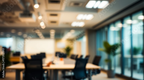 Soft blur of an office space with minimalist design and bright natural lighting, creating a calm work environment.