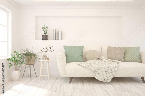 Soft color living room with sofa. Scandinavian interior design. 3D illustration