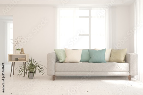 Soft color living room with sofa. Scandinavian interior design. 3D illustration