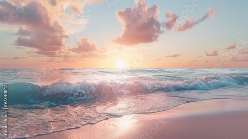 Soft colored sunset on a tropical beach with waves and clouds in a clear sky