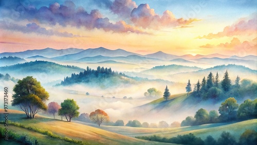 Soft, dreamy, and serene, a whimsical watercolor landscape features gentle hills, lazy clouds, and a misty horizon, all blended in soothing pastel hues.