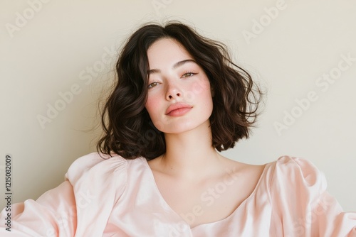 Soft Feminine Aesthetic in Modern Marketing Young Woman in Pastel Pink Blouse on Cream Backdrop - Emotional Branding and Elegance in Digital Campaigns