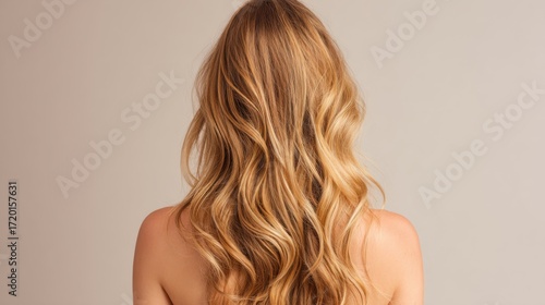 Soft, flowing blonde hair cascades in gentle waves, viewed from the back. The neutral background emphasizes the hairs texture and color, highlighted by soft lighting.