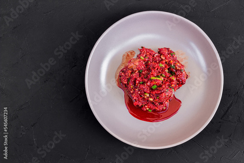 Soft focus Raw beef spicy minced meat salad, Northeastern Thailand local food