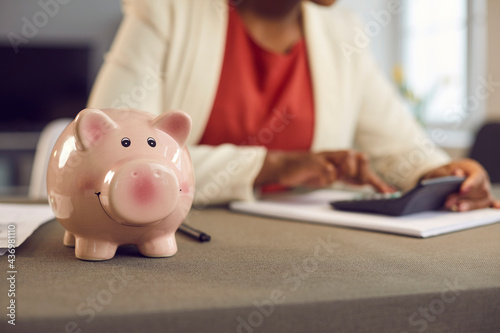 Soft focus shot of pink piggy bank standing on table up close, thrifty young woman with calculator calculating expenses, savings or business profit in background. People, money and finance concept