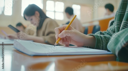 soft focus.high school or university student holding pencil writing on paper answer sheet.sitting on lecture chair taking final exam attending in examination room or classroom.student in uniform.