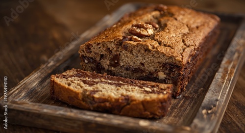 Soft gluten free banana bread with rich chocolate and walnut mix displayed on wooden tray