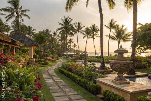 Soft Golden Lighting Enhances the Beauty of a Serene Tropical Garden with Lush Greenery and Flowers