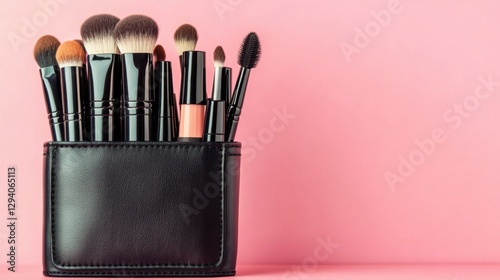 Soft leather makeup organizer sitting on a stylish table, pink background
