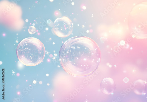 Soft Pastel Bubbles Floating in a Dreamy Light Blue Sky with Sparkling Effects