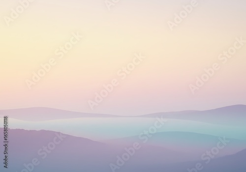 Soft pastel hues of a misty mountain landscape at dawn