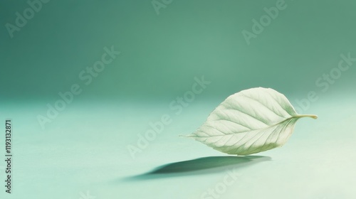 Soft pastel mint gradient with a delicate leaf creating a tranquil ambiance in an ethereal space