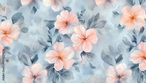 Soft Pastel Watercolor Flower Pattern on Aged Blue Background