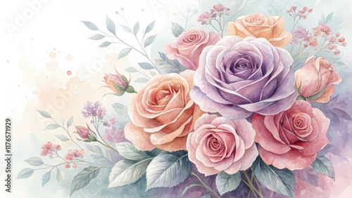 Soft Pastel Watercolor Roses Arrangement with Delicate Foliage
