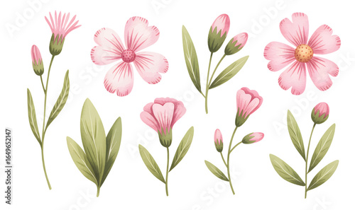 Soft pink cosmos flowers with buds and green foliage. Cosmos blossoms with stems and leafy accents in watercolor.