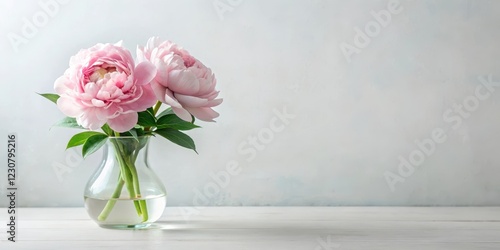 Soft pink peony flower arrangement in a minimalist vase with subtle greenery, flower arrangement, greenery