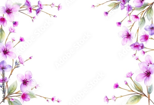 Soft purple watercolor floral frame, delicate blooms & leaves, background, template