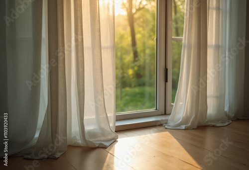 Soft, sheer curtains gently sway in the warm breeze, framing a picturesque view of a sunlit garden beyond the glass door. The golden rays of sunlight spill onto the polished wooden floor, creating a