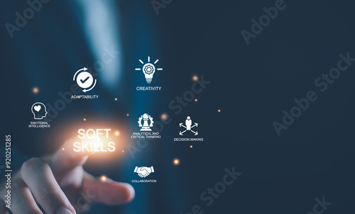 Soft skills HR concept. Business man with icons of soft skills, emotional intelligence, creativity, collaboration, adaptability, decision making and analytical thinking. Soft skills business training