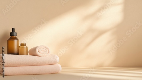 towel, amber, bottle, spa, relaxation, wellness, calm, serene, peach, folded, glasses, warm, soft, light, background, atmosphere, calmness, beauty, skincare, minimalist, soothing, peaceful, elegant, luxury, therapy, massage, bathe, hygiene, clean, fresh, natural, organic, holistic, health, pampering, indulgence, rejuvenation, comfort, aesthetic, decor