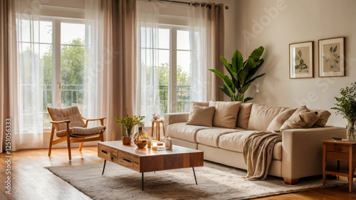 Softly blurred modern home interior with large windows and warm natural sunlight.
