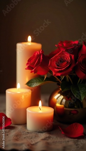 Softly glowing candles surround a lush red rose bouquet, decor, warm