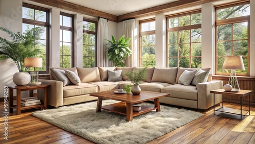 beige, sectional, couch, wooden, hot drink, table, rug, large, window, room, furniture, decor, comfort, relaxing, textile, upholstery, fabric, flooring, carpet, carpeting, grain, vintage, stylish, elegant, sophistication, calm, brightness, natural, airy, roomy, inviting, warm
