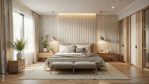 Softly lit, minimalist bedroom features a plush white bed, natural wood furniture, and floor-to-ceiling curtains in a calming, neutral color palette.