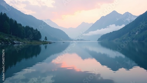 Softly lit mountainous landscape with serene lake at dawn, tranquil water reflecting the pastel colors of the sky, mist rising from the hills in the background, tranquil, reflection