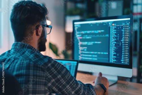 developer, coding, software, programming, monitor, computer, office, technology, project, code, information technology, modern, sharpened, digital, engineer, workspace, development, professional, goggles, tech, working, datum, typing, laptop, desktop, system, innovation, night, study, language, concentrated, work, application, computing, tool, setup