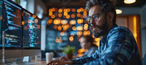 Software developers coding a new app in a creative, energetic office environment