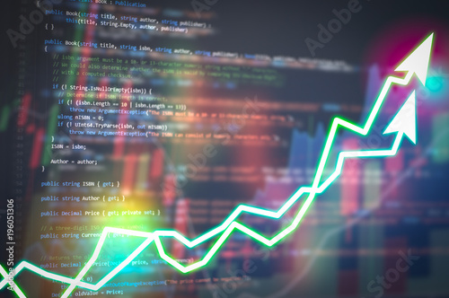 Software development. Programming code abstract technology background and Stock market digital graph chart on LED display concept. Indicator financial forex education development coding code program.
