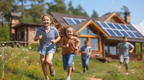 Solar cell. Happy family running near their house with solar panels on roof. Alternative energy, saving resources and sustainable lifestyle concept.