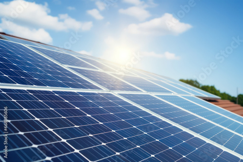 Solar Cell Panel on House Roof Under a Clear Blue Sky - Green Energy at Home