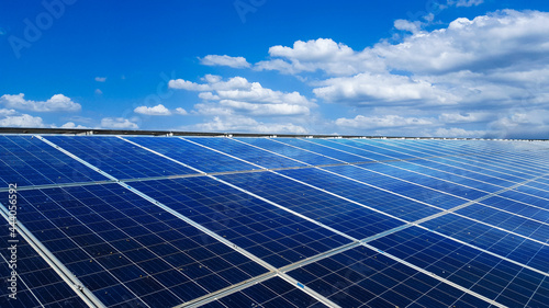 Solar cell panels installed on the roof top of a house become dirty caused by birds poops, with white clouds ,blue sky and the sunlight, to provide power to the house, to go green energy concept