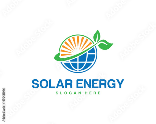 Solar energy logo vector template with globe and leaf design for renewable power solutions and environmental sustainability