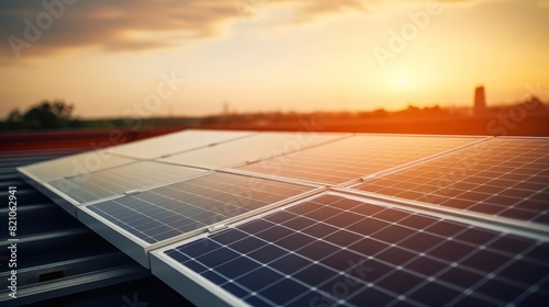 Solar energy panels on rooftop, ecofriendly solution, selective focus, theme of green living, vibrant, Fusion, backdrop of sunset glow