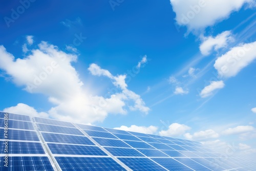 Solar energy panels with a vibrant blue sky and fluffy clouds above, symbolizing clean energy and environmental sustainability.