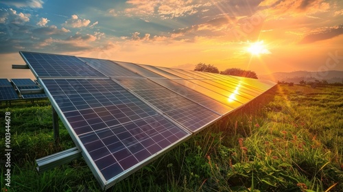 Solar Panel Cells on grass outdoor nature sunset for Alternative energy source AI generated image