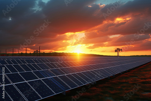 Solar Panel farm field at sunset renewable energy sustainable future, generated ai