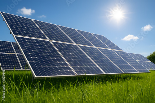 Solar panel installation renewable energy system in green field sunny