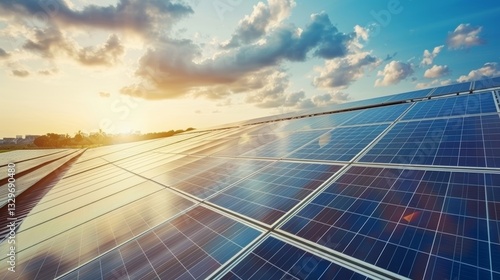 Solar panel on factory or house roof top. Photovoltaic power supply systems. Solar power plant. The source of ecological renewable energy, environment, power, technology