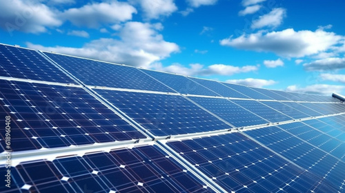 Solar panel with blue sky and clouds. concept clean energy, electric alternative, power in nature.