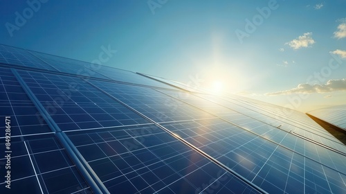 Solar panels against a bright sky generating renewable energy with a sunbeam on a clear day, symbolizing a clean and sustainable future.