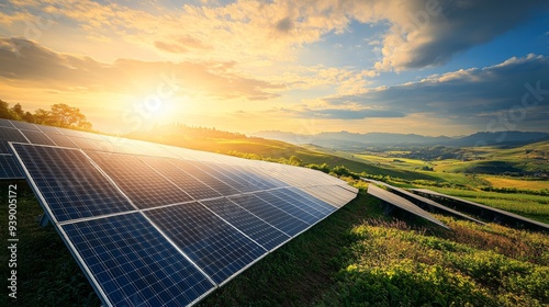 Solar panels are arranged in rows on a hillside, capturing sunlight during the golden hour, surrounded by lush greenery and rolling hills