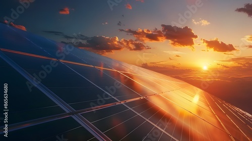 Solar panels at sunset reflecting warm sunlight. Concept of renewable energy, sustainability, green energy and environment