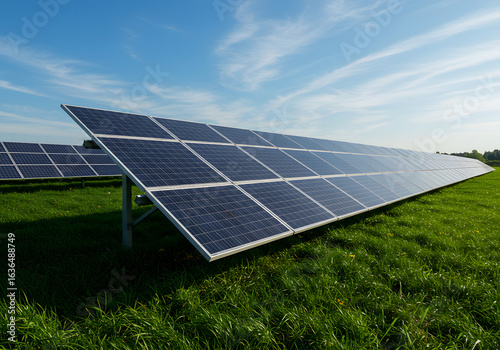 Solar panels energy renewable power electricity photovoltaic cell technology farm field blue sky grass