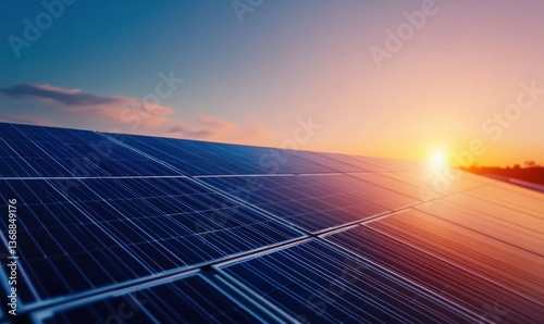 Solar panels gleam under the vibrant colors of a beautiful sunset, generating clean energy.
