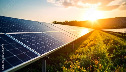 solar, panel, energy, field, sunset, nature, environment, technology, renewable, clean, power, green, sustainable, electricity, sunlight, system, photovoltaic, installation, landscape, industry, rural, agriculture, modern, view, beautiful, sky, horizon, light, gold, ray, future, innovation, development, investment, growth, farmland, grass