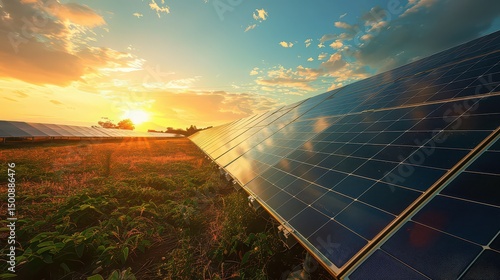 solar panel, sunset, field, blue skies, orange sky, warm light, renewable energy, clean energy, solar farm, alternative energy, electricity, power generation, sustainable, environment, technology, innovation, solar energy, horizon, cloud, sun, daylight, outdoors, flora, green energy, photovoltaic, energy efficiency, conservation, climate change, grid
